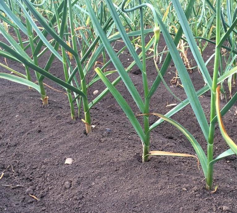 Немаловажное значение имеет и густота посадки семенного материала, и состав почвы, и качество посадочного материала. Надо не забывать так же, удалять стрелки. Когда листья чеснока достигнут высоты 10-15 см, отгребают землю от луковицы, обсыпают золой и возвращают землю на место. Эту операцию повторяют при появлении стрелок.Стрелки регулярно убирайте в начале их образования. Убирают стрелкующийся чеснок при пожелтении листьев, нестрелкующийся – при полегании листьев.